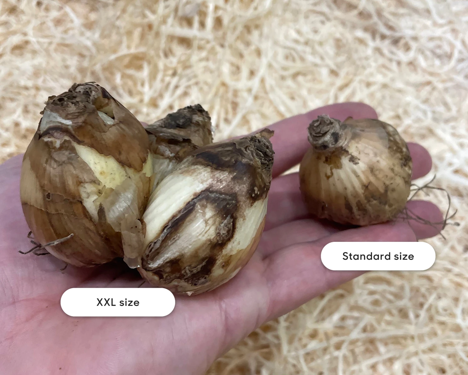 Planting one of our Narcissus ‘Tête à Tête XXL’ bulbs is essentially planting a ready-formed little group of bulbs. This means that not only will you enjoy cute groups of daffodils sooner, but you can dig fewer holes to achieve this natural, established effect! Bulb sizing refers to an average measurement around the circumference of the bulb cluster. What you can expect to receive is a cluster of bulbs which can be planted together in one piece.