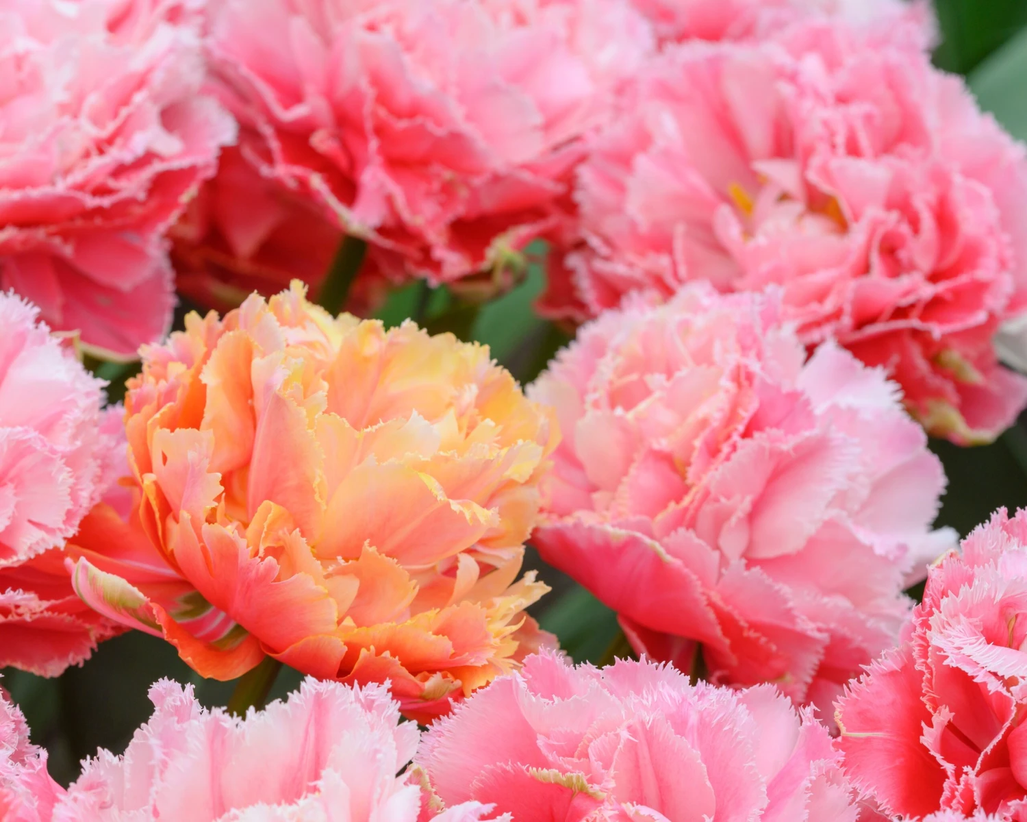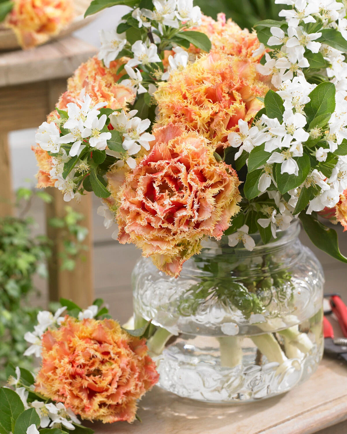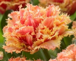 Beautiful and long-lasting, Tulip ‘Brisbane’ will delight you when in full flower—the richness of the blooms bring to mind the lusciousness of peonies. Tulip ‘Brisbane’ is a fabulous compact, double flowering variety, producing stunning orange, peach, pink and light yellow, cup-shaped, ruffled flowers. Each petal has a finely fringed edge. The leaves are broad, lance-shaped and a beautiful blue-green. Relatively new, and rarely seen for sale, it is a tulip to savour.   Â