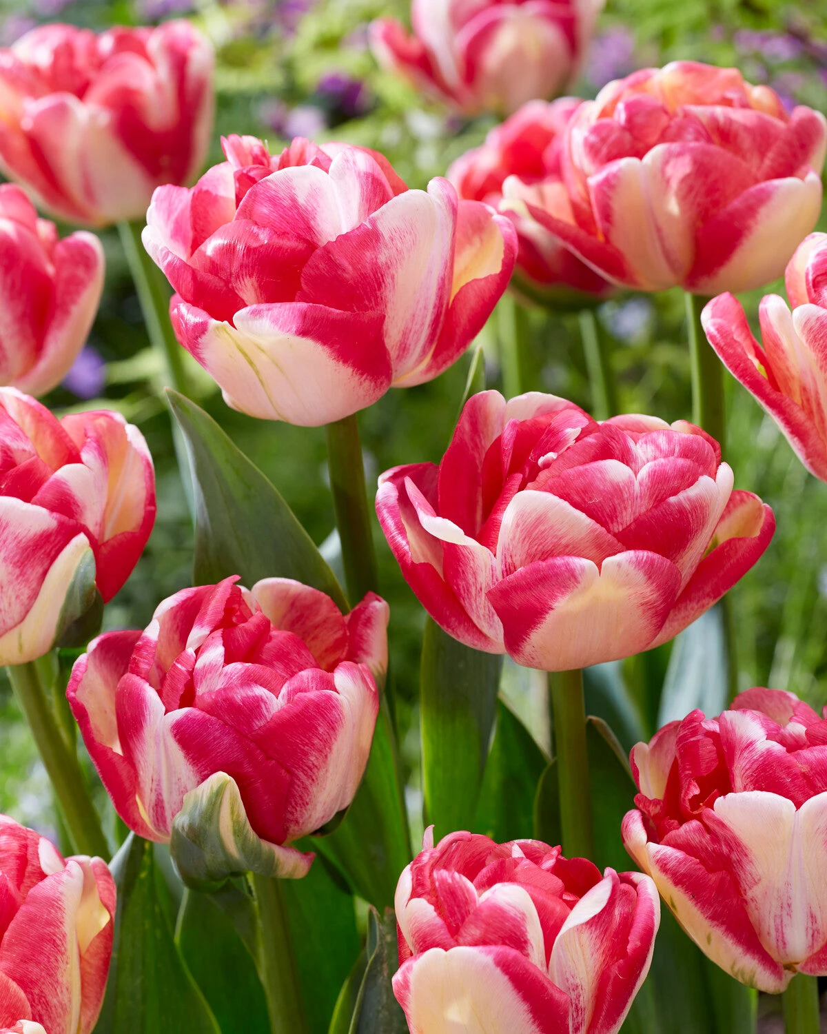 Tulip ‘Double Blizz’ is a brand-new variety and is not widely availableโyet! It has performed wonderfully well in trials and we predict a very bright future for it. The petals of this tulip are delicate-looking, yet sturdy. They are fuchsia-pink and white, in near enough equal measure, often with green markings in the white sections. The flowers are beautifully bowl-shaped, and become even more dramatic when they open out fully. They appear over several weeks in April and May. From a distance, you could easily mistake these late-flowering tulips for dramatic peonies, so Tulip ‘Double Blizz’ is an excellent choice for extending the blooming season.ย